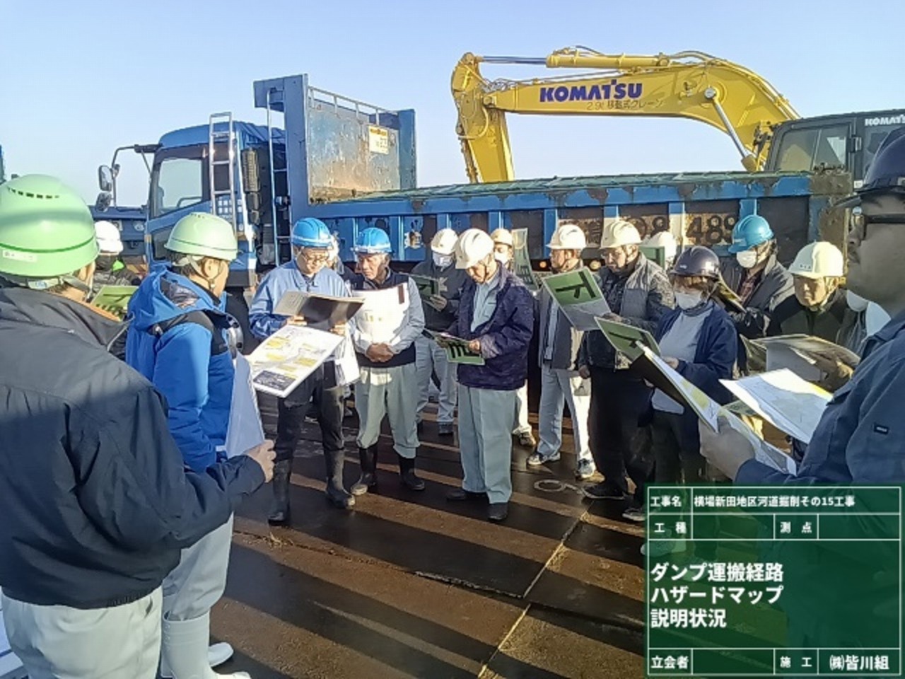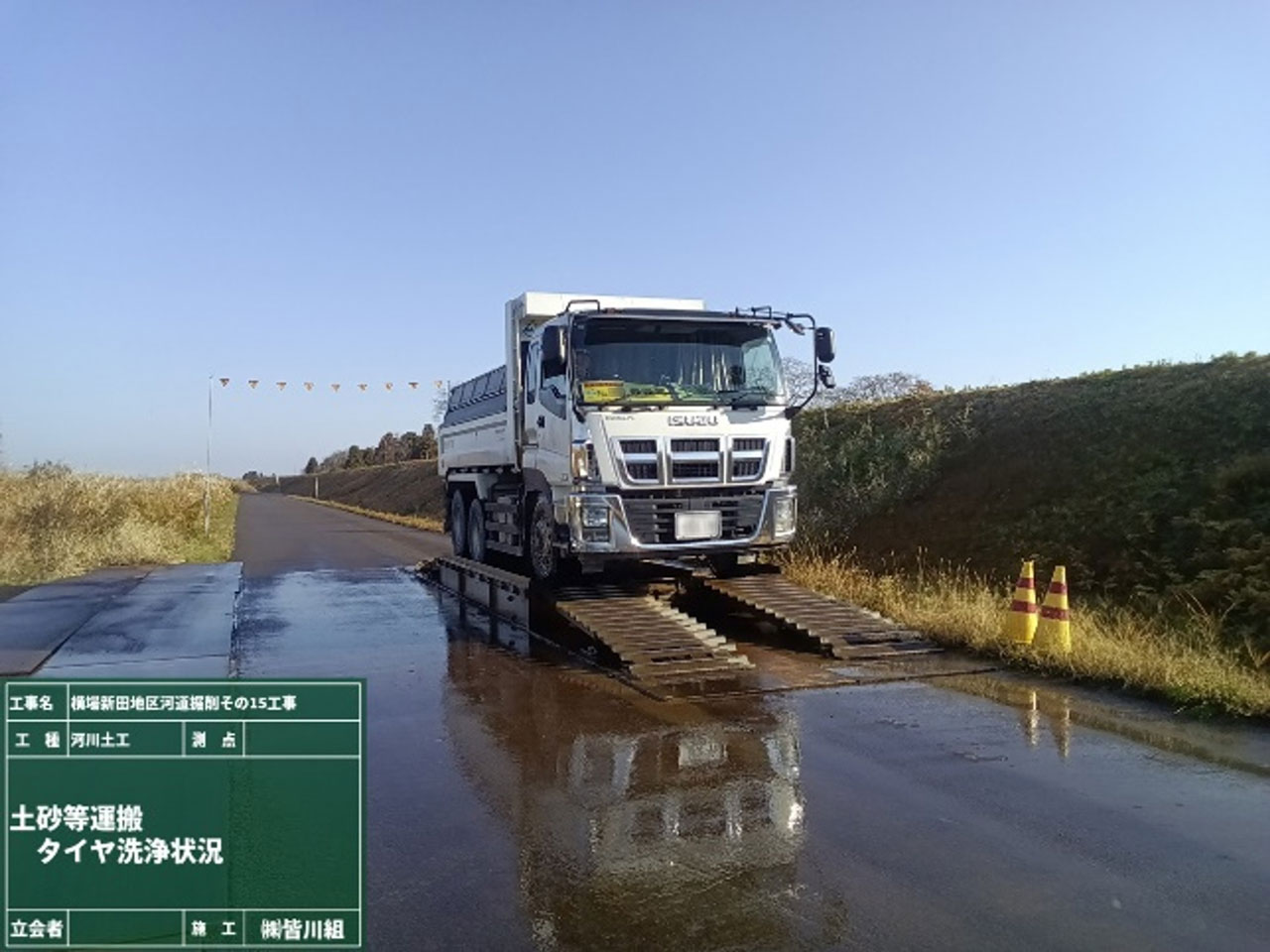 11月末より掘削・土砂運搬が開始しました。下記写真のように、タイヤ洗浄による防塵・泥落対策、ハザードマップ説明による、ダンプ運転手の教育を実施し安全に努めてまいりますのでご理解・ご協力のほどよろしくお願い致します。